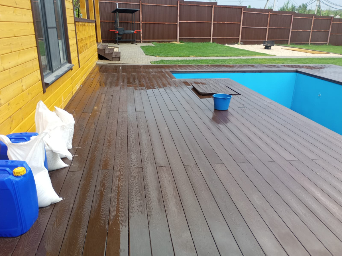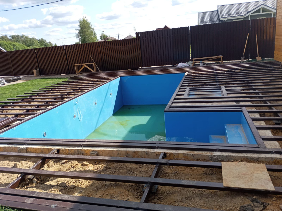 Смонтирован настил у бассейна (металлокаркас на сваях). Торцы зашиты доской. По периметру отделка ступенью шириной 165 мм.