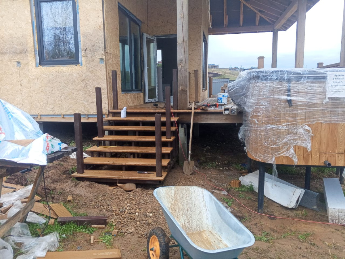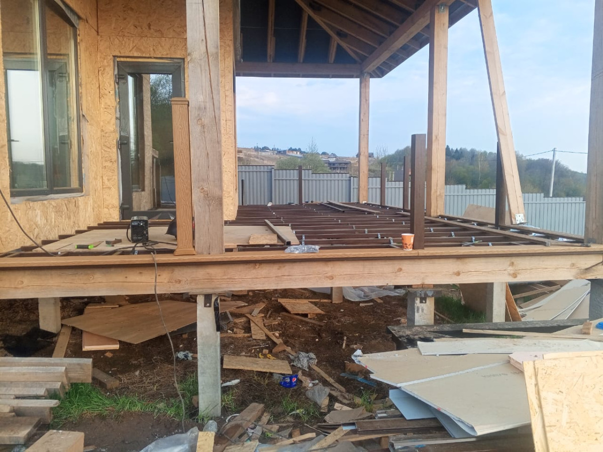 На каркас из бруса установлен металлопрофиль и смонтирована доска. По периметру отделка ступенью шириной 165 мм. Сделаны ступени и ограждение.
