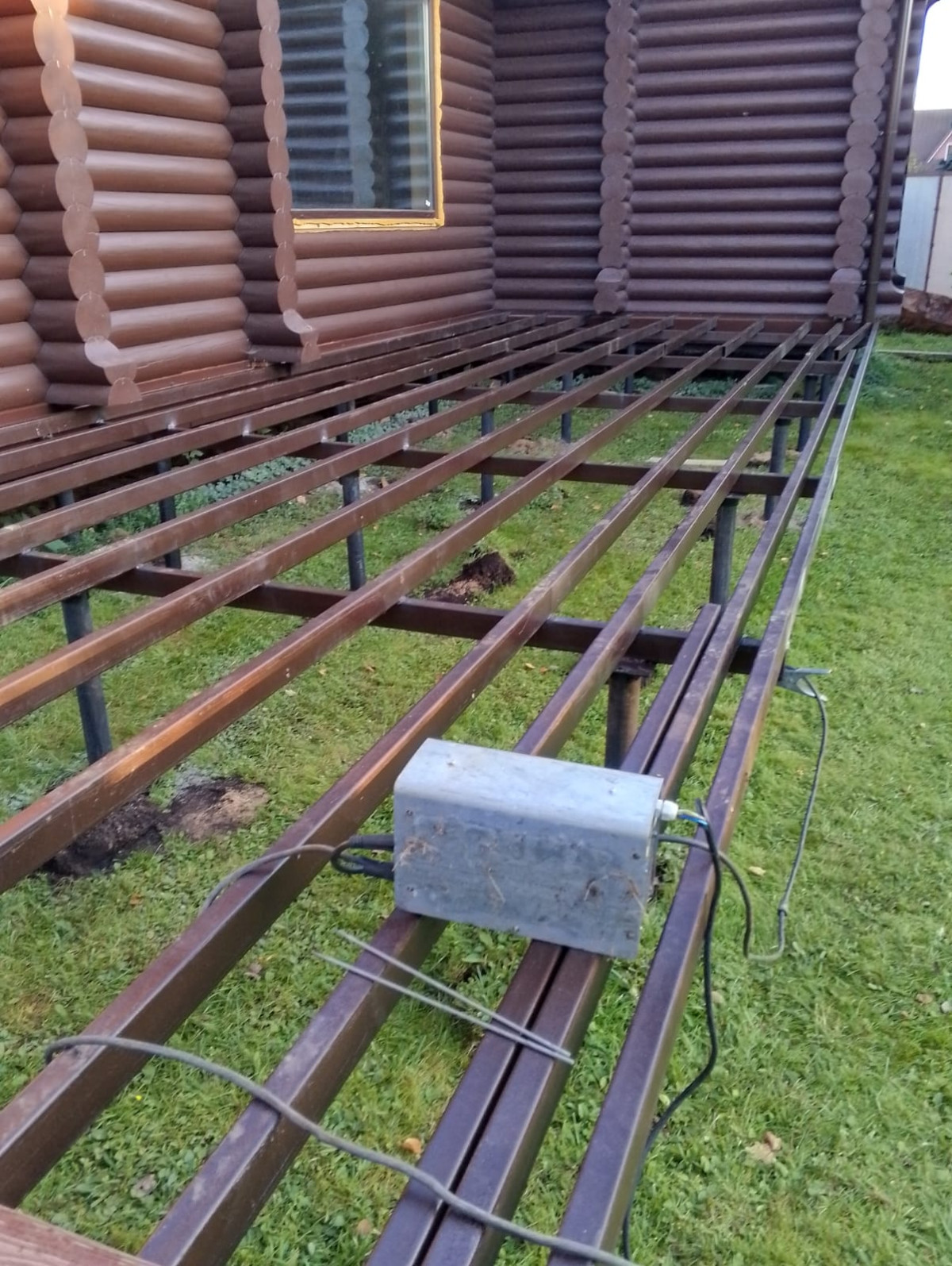 Произведен монтаж террасы с металлокаркасом на бетонном основании и сваях. Смонтировано ограждение и ступени. Торцы настила зашиты доской.